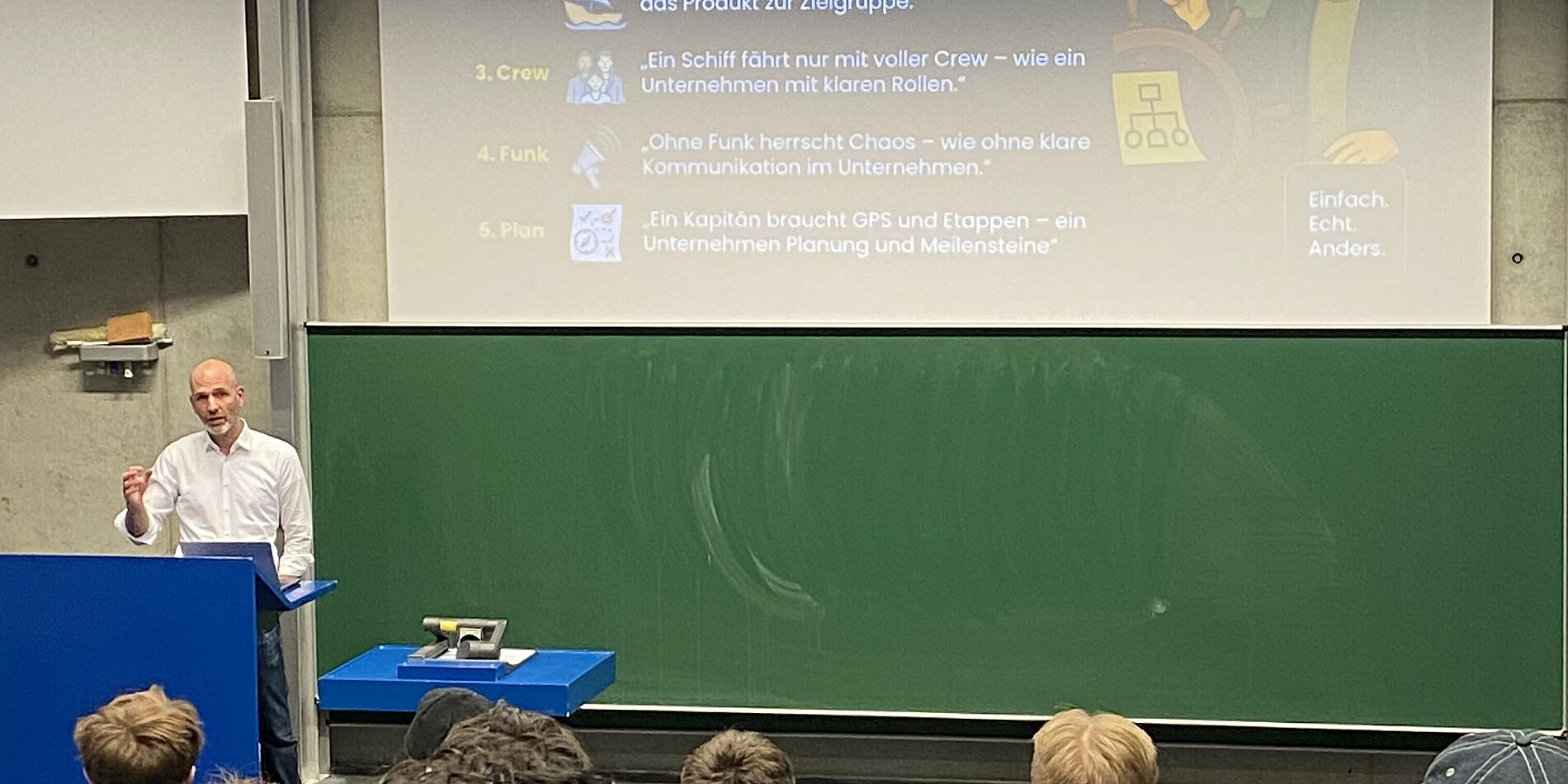 Neben seiner Erfahrung als Unternehmer und Geschäftsführer eines mittelständischen Unternehmens brachte Maximilian Krä auch wertvolles Know-how aus seiner eigenen Start-up-Gründung ein. Die Analogie einer Schiffsreise und der Einbezug von persönlichen Anekdoten, praxisnahen Beispielen und interaktiven Übungen machten den Vortrag besonders lebendig – und motivierten die Studierenden, das Gelernte direkt anzuwenden.