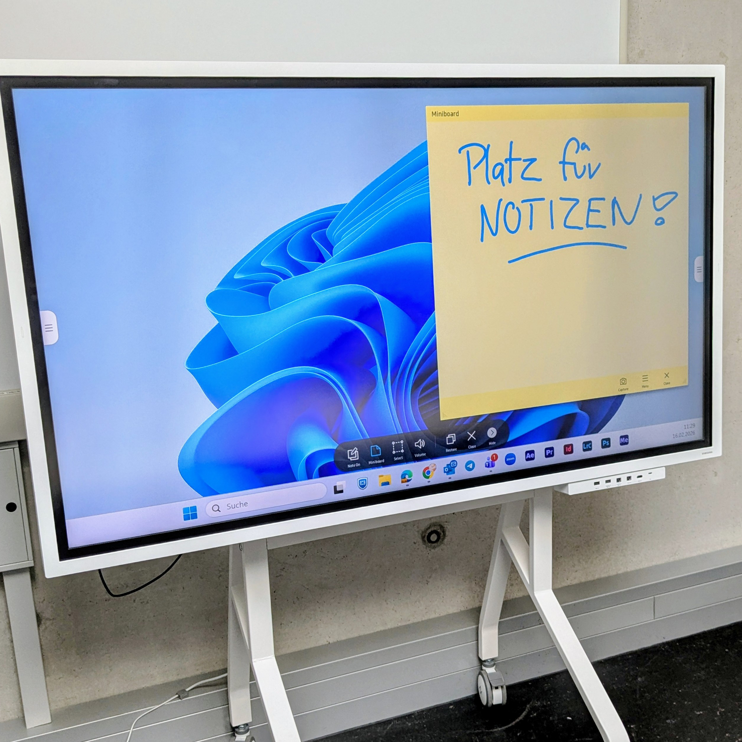 Anstelle eines Papier-Flipcharts, kann diese digitale Lösung verwendet werden. Es kann als reiner Monitor dienen, bietet aber diverse Applikationen für die Nutzung als Whiteboard. Mit dem enthaltenen Stift können sie Zeichnen, Schreiben oder auch Overlays anfertigen. Auf Windws-Geräten lässt es sich über die Tastenkombination Win+K drahtlos in Sekunden verbinden. Auch mobile Schnittstellen für Smartphones sind vorhanden, ebenso LAN- und USB-Anschlüsse zum Teilen von Webinhalten oder eigenen Materialien.