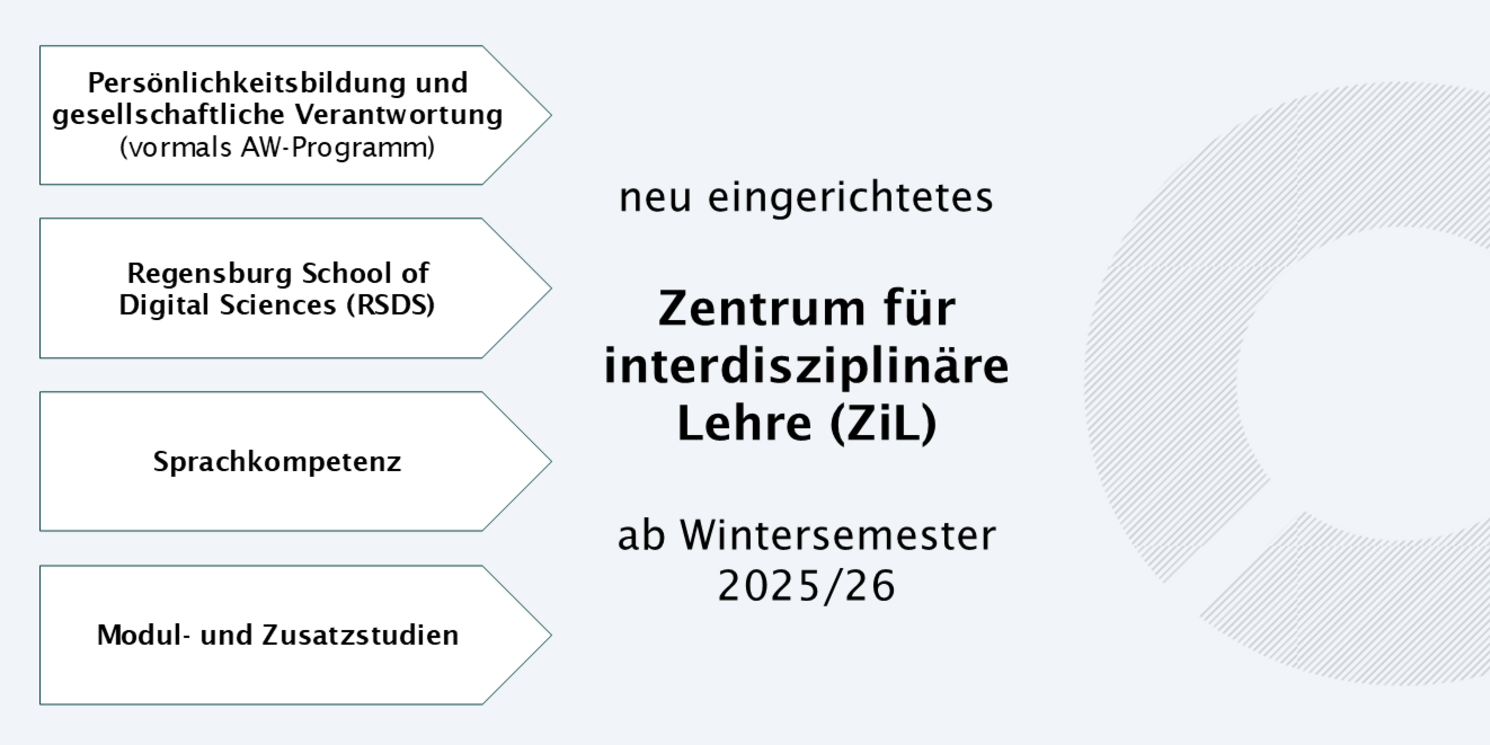 Mit dem Zentrum für interdisziplinäre Lehre (ZiL) entsteht eine zentrale Anlaufstelle für alle fakultätsübergreifenden Lehrangebote der OTH Regensburg. Das ZiL bündelt bestehende Formate (siehe Grafik), entwickelt sie strategisch weiter und schafft transparente, sichtbare Strukturen für innovative Lernangebote, die Future Skills im Sinne einer ganzheitlichen Bildung vermitteln.