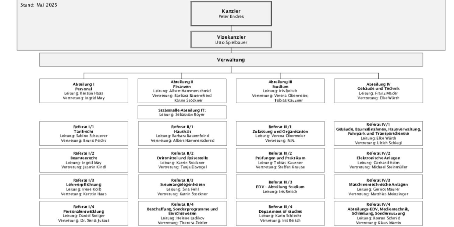 Die Verwaltung der Ostbayerischen Technischen Hochschule Regensburg ist Ihre Anlaufstelle in allen Belangen, die mit Personal, Finanzen, Studienbedingungen (Organisatorisches, Prüfungen, etc.) oder der technischen Versorgung der Hochschule zu tun haben. Die Hochschulverwaltung gliedert sich in vier Abteilungen und wird von dem Kanzler geleitet.