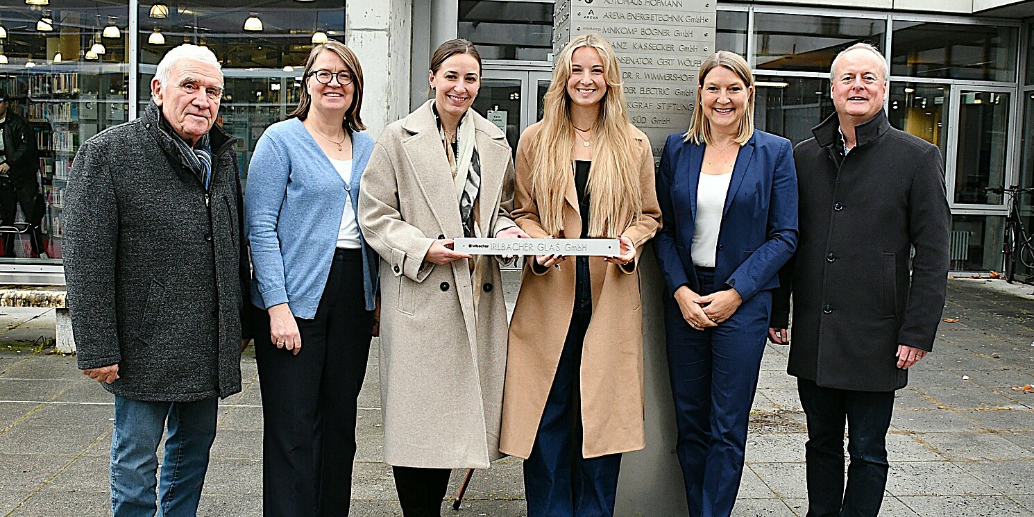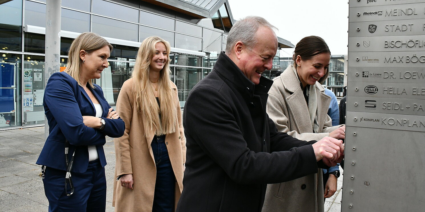 Gert Wölfel, founder and long-time driving force behind the foundation, and foundation chairman Dr Bernd Waffler were particularly pleased about this. For more than two decades, the foundation has been working to attract supporters for OTH Regensburg. It didn't take much persuasion to convince Irlbacher. "I completed my bachelor's degree in business and management at OTH Regensburg this year during the summer semester, and my sister is currently studying industrial design at OTH Regensburg. For us, this closes the circle. When we bring business and education together, it creates added value for both sides," says Ines Irlbacher, who came to the university with her sister Anna Irlbacher for the unveiling of the new sign. The family-run group of companies produces high-tech flat glass solutions for the global market and relies on new technologies to keep resource consumption and environmental emissions in production as low as possible.
