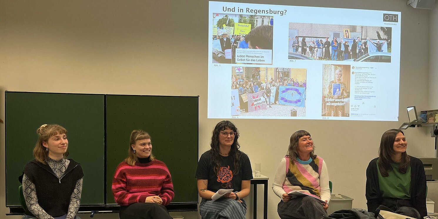 Das Thema reproduktive Gerechtigkeit stand im Mittelpunkt der zweiten Veranstaltung und wurde mit den vier Expertinnen Claudia Alkofer (profamilia Regensburg), Eva-Maria Meier (profamilia Niederbayern-Oberpfalz e. V.), Emma (pia Regensburg) und Lea (msfc Regensburg) und der Moderatorin Miriam Kerl diskutiert. Sowohl wissenschaftliche Studien als auch die Erfahrungsberichte von Beraterinnen im Bereich Schwangerschaftsabbrüche zeigen deutlich, dass die anhaltende gesetzliche Rechtswidrigkeit von Schwangerschaftsabbrüchen in Deutschland die freie Wahl von schwangeren Frauen deutlich einschränkt. Zwar gibt es die Möglichkeiten unter bestimmten Bedingungen einen Schwangerschaftsabbruch vornehmen zu lassen. Neben der gleichzeitig anhaltenden gesellschaftlichen und individuellen Stigmatisierung ist es aber v.a. die schlechte ärztliche Versorgungslage, die große Hürden bei einer Entscheidung für eine Abbruch aufbaut. Es gibt zu wenig Ärzt*innen, die Abbrüche im Rahmen der Gesetzeslage anbieten; insbesondere Bayern, Baden-Württemberg und Rheinland-Pfalz sind unterversorgt. Auch die Situation in Regensburg hat sich stark verschlechtert. Die Diskutantinnen sprachen sich deutlich dafür aus, Schwangerschaftsabbrüche aus dem Strafgesetzbuch herauszunehmen, wie es auch schon eine von der letzten Bundesregierung eingesetzte Expertinn*enkommission empfohlen hatte.
