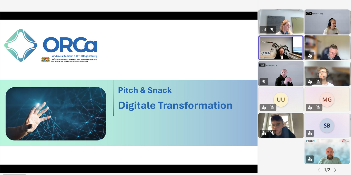 Den Auftakt bildete das Thema Digitale Transformation. Im Rahmen des 30-minütigen Online-Formats wurden kompakt und praxisnah themenspezifische Fördermöglichkeiten vorgestellt. Darüber hinaus präsentierten Professorinnen und Professoren ihre aktuellen Forschungsschwerpunkte und laufenden Projekte in diesem Bereich. Ergänzt wurde das Programm durch zwei spannende Pitches junger Start-ups. Vorgestellt wurden innovative Ansätze zu zivilen Abfangdrohnen sowie die App „Regensburg Sidequest“. Damit bot Pitch & Snack eine vielseitige Plattform für unterschiedliche Themen, Perspektiven und Zielgruppen rund um die Digitale Transformation – interdisziplinär, praxisnah und offen für neue Ideen.