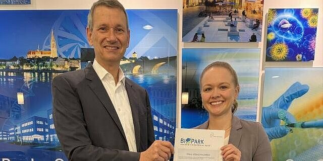 Einen weiteren BioPark Innovationspreis 2025 erhielten die Herren Dr. Konstantin Scholz und Dr. Florian Pielnhofer für die Identifikation von Samariumsalzen als mögliche neuartige Wirkstoffe zur Kariesprävention. Karies ist global die häufigste Erkrankung, die durch bakteriellen Biofilm und mangelnde Mundhygiene stark beeinflusst wird. Weltweit geschätzte zwei Milliarden betroffene Menschen – und das trotz weit verbreiteter Mundhygieneprodukte – zeigen den besonders hohen Bedarf an neuartigen Therapeutika.