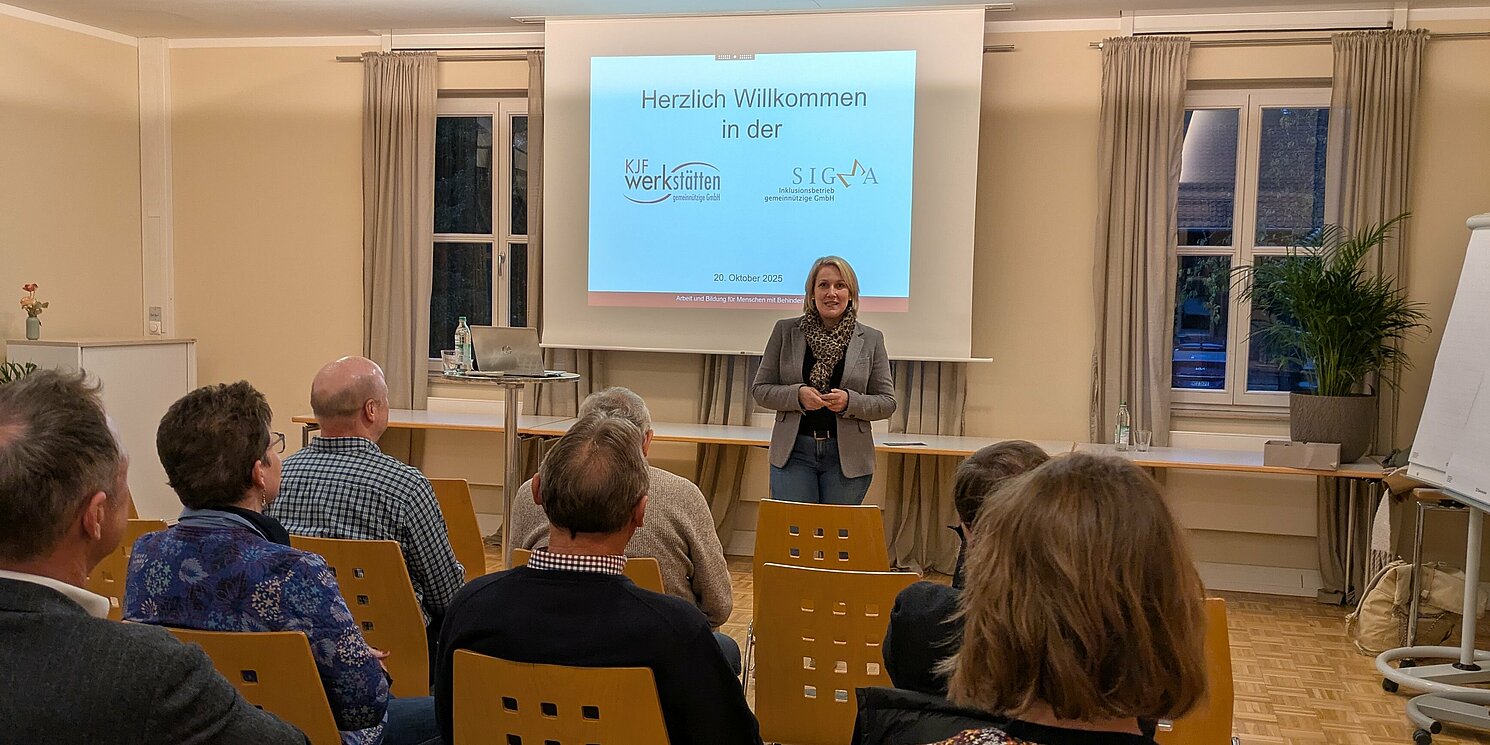DER Hermannsberg ist Teil einer der 8 Standorte der KJF Werkstätten gGmbH. Melanie Eibl, Geschäftsführerin, stellte den Gästen anschließend das Konzept des gemeinnützigen Unternehmens vor. Ziel des Unternehmens ist es, Teilhabe am Arbeitsleben, berufliche Bildung und Qualifizierung für Menschen mit Behinderung zu ermöglichen und ganz wichtig, wenn möglich die Vermittlung auf den ersten Arbeitsmarkt. Hier spielt die Nähe zur Industrie durch die Bearbeitung entsprechender Aufträge, aber auch die enge Zusammenarbeit mit Inklusionsbetrieben eine wichtige Rolle, denn die größte Herausforderung liege, so Eibl, bei der Gestaltung der Übergänge. DER Hermannsberg ist eine Kooperation aus KJF Werkstätten und SIGMA Inklusionsbetrieb.