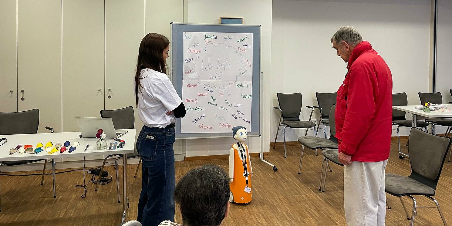 Interessierte BesucherInnen sowie BewohnerInnen hatten die Gelegenheit, direkt mit dem Navel zu sprechen, ihm Fragen zu stellen und mehr über seine Fähigkeiten zu erfahren. Außerdem durften die Gäste eigene Namensvorschläge für den Roboter einbringen.