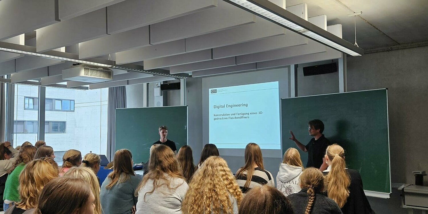 Die Schülerinnen hatten die Gelegenheit, unter der Anleitung von Prof. Dr. Florian Nützel einen digitalen Zwilling eines Flaschenöffners zu optimieren und diesen anschließend mit dem 3D-Drucker zu fertigen. Als Höhepunkt öffneten sie mit ihren selbstgedruckten Flaschenöffnern erfolgreich Spezi-Flaschen und diskutierten angeregt über den Prozess.