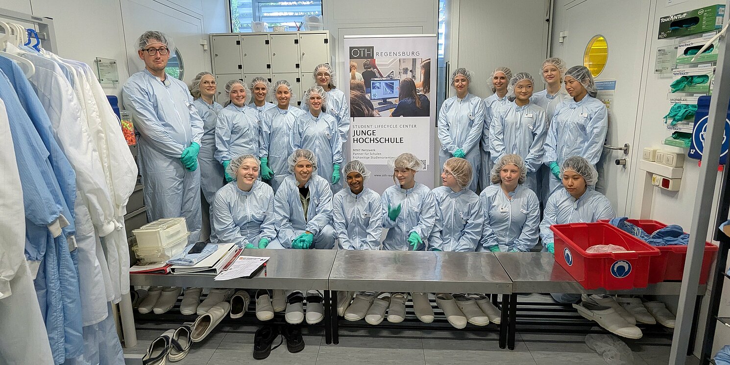 Ein Highlight war der Besuch des Reinraums der OTH Regensburg, wo die Schülerinnen unter Anleitung von Dagmar Hornik, Chemisch-Technische Assistentin, die wichtigsten Stationen der Chipherstellung kennenlernten. Besonders beeindruckt zeigten sich die Teilnehmerinnen von der Reinraumtechnik und der Tatsache, dass die Luft dort sogar sauberer ist als in einem Operationssaal.