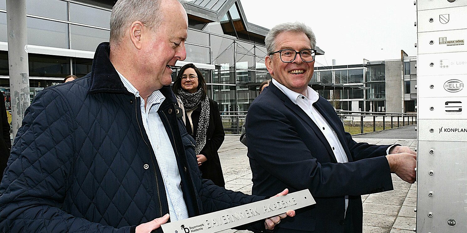 „Die Förderung der Fachkräfte von morgen ist eine gemeinsame Aufgabe von Wirtschaft und Wissenschaft“, sagte Albert Zettl, Personal- und Marktvorstand der Bayernwerk AG. „Mit unserer Zustiftung möchten wir die Studierenden der OTH Regensburg gezielt unterstützen und gleichzeitig die enge Zusammenarbeit im Bereich Energietechnik weiter stärken.“ Gemeinsam mit Stiftungsvorstand Bernd Waffler brachte Albert Zettl das neue Schild an der Stifter-Stele an.