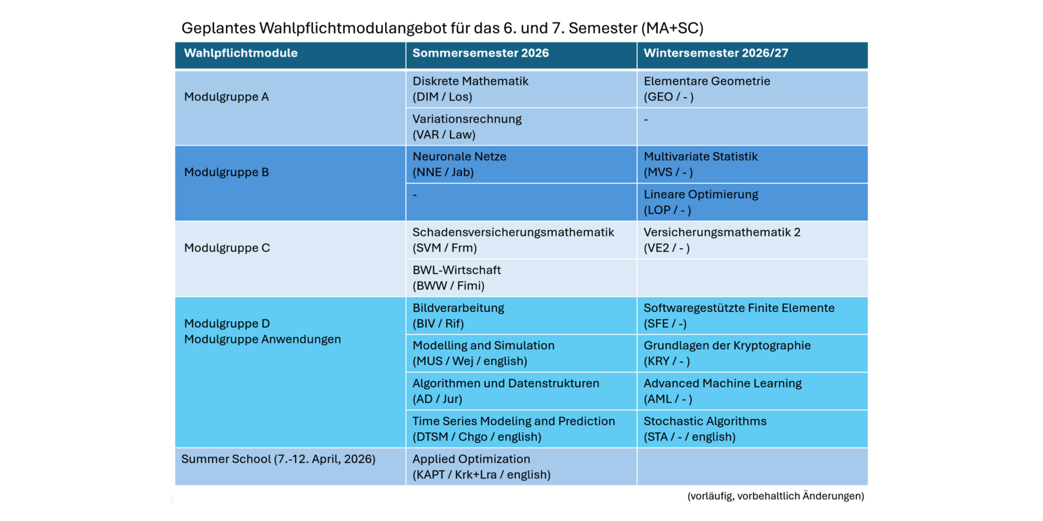 - Mathematische Grundlagen: u.a. Lehrveranstaltungen im Bereich Analysis, Lineare Algebra, Wahrscheinlichkeitstheorie und Statisik, Numerische Mathematik, Elementare Zahlentheorie und Gewöhnliche Diffferenzialgleichungen