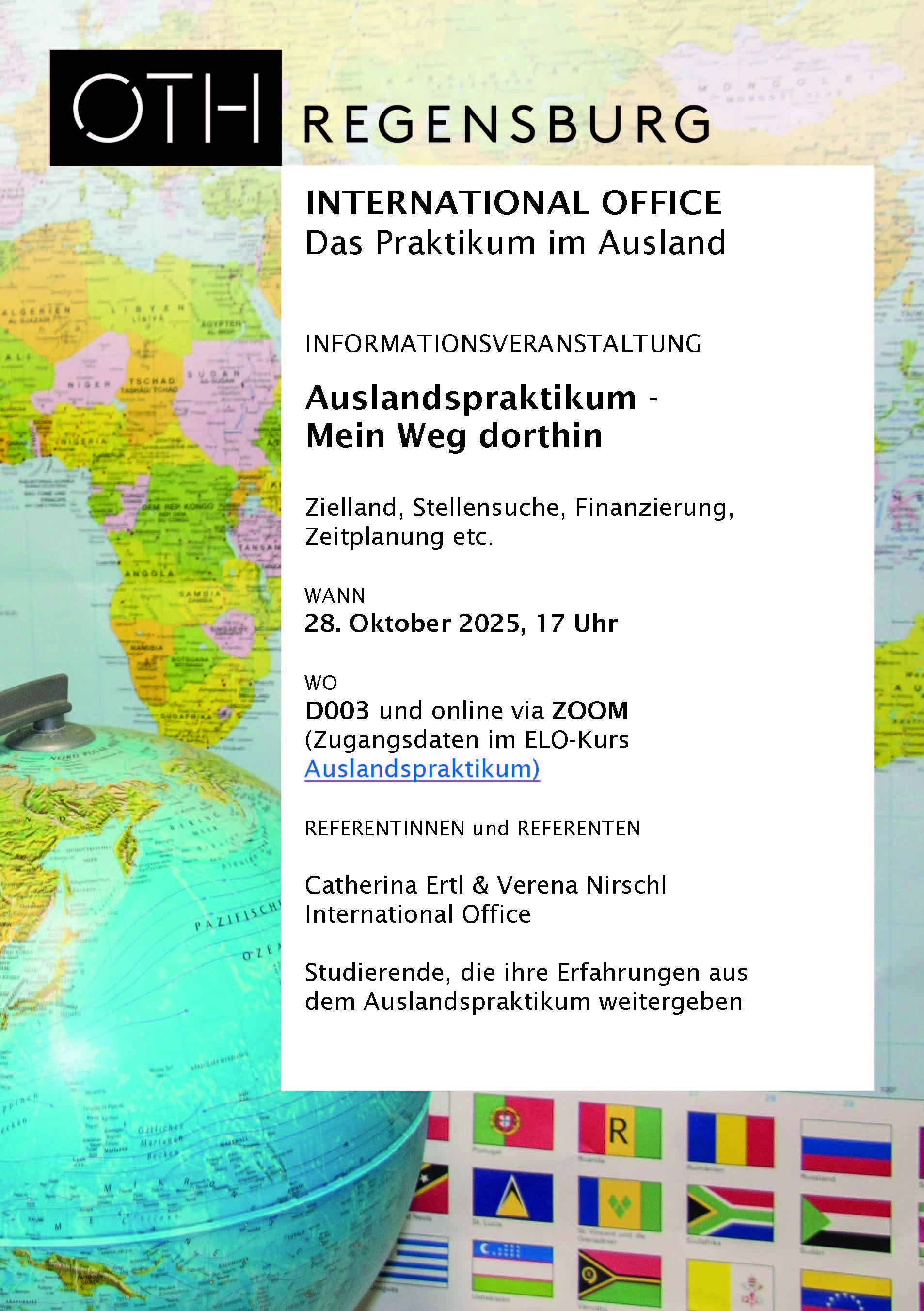 Die Veranstaltung findet hybrid im Hörsaal D003 und via Zoom statt. Die Zoom-Zugangsdaten und weitere Informationen finden Sie in unserem ELO-Kurs: Auslandspraktikum (Internship abroad).